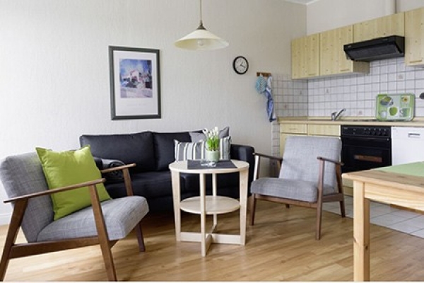 2-Raum-Wohnungen bieten einen Wohnraum mit integrierter Küche, einen Schlafraum und Dusch-Bad. Im Wohnraum gibt es die Möglichkeit ein Schlafsofa einzurichten. Diesen Wohnungstyp finden Sie auf dem Hof in der Dorfmitte.