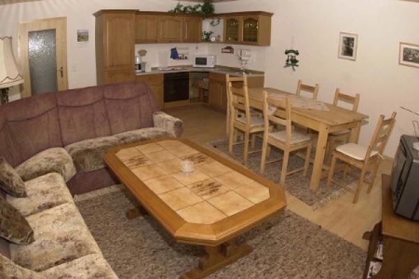 Die größte Wohnung auf der 1. Etage für 1-4 Personen verfügt über einen Wohnzimmer mit Küchenecke und Essplatz, einen Schlafzimmer mit 2 Betten, einen Zimmer mit Etagenbett, einen Flur, ein Bad mit Dusche. Es ist Aufbettung möglich.