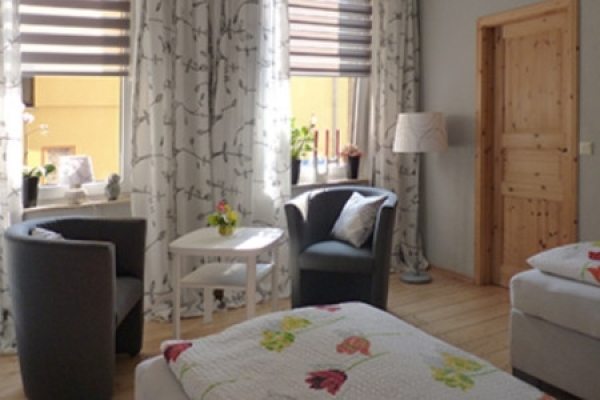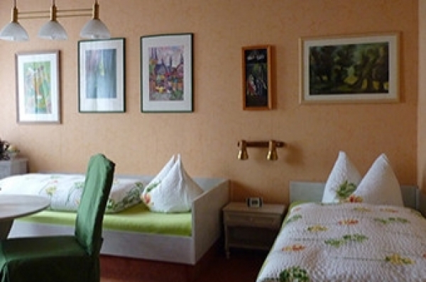 Die Nichtraucherzimmer der Pension „Zum Rüdesheimer“ liegen zur Hof- und Gartenseite und bieten absolute Ruhe. Eine Aufbettung ist möglich. Der große, mediterran gestaltete Innenhof lädt zum Verweilen ein. Erfreuen Sie sich im Haus an über 100 Originalbildern, die größtenteils selbst gemalt wurden. Eine Fahrrad- und Motorradgarage steht kostenlos zur Verfügung. Das reichhaltige Frühstück mit selbst gemachter Konfitüre, Apfel-Grieben-Schmalz, Kräuter für Tee und Quark aus unserem Hausgarten nehmen Sie im Restaurant ein.