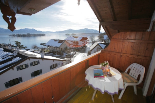Traumhaft ist der Blick von den Balkonen auf den malerischen Chiemsee mit seinen drei Inseln und dem eindrucksvollen Panorama der Chiemgauer Alpen.