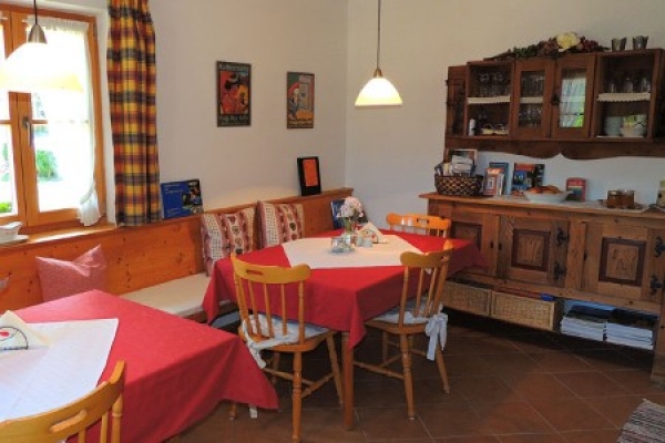 Das Gästezimmer 2 im Landhausstil für 4 Personen hat ein Doppelzimmer, ein Frühstücksraum mit Teeküche und Kühlschrank, TV, WLAN, eine Dusche, ein WC und ein Balkon mit Bergblick.