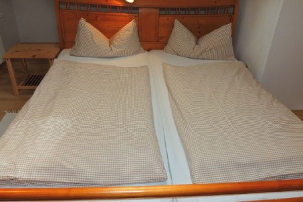 Das Gästezimmer 1 ist im Landhausstil mit Doppelbett, Frühstücksraum mit Teeküche und Kühlschrank, Duschbad mit Extra-WC, TV, WLAN und Terrasse ausgestattet.