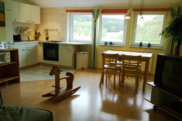 Die Pension „Mausmühle“ bietet Ihnen eine kinderfreundliche, helle und geräumige Ferienwohnung an. Die Wohnung hat 2 große Schlafzimmer, eine Wohn- und Essküche mit Fernseher, Herd und Backofen, ein Bad und ein WC. Es gibt einen Grillplatz, eine Spiel- und Liegewiese mit Liegestühlen und einen naturnahen Spielplatz.
