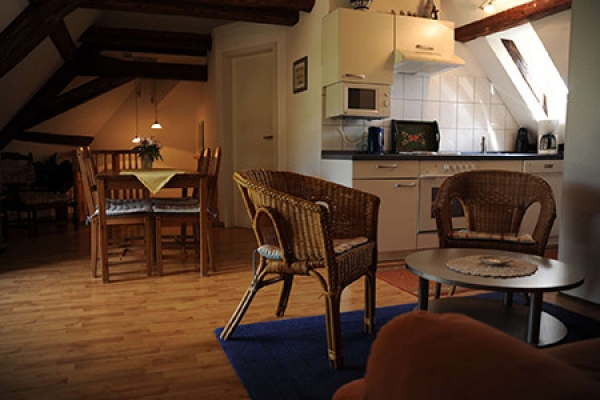 Die 4 Ferienwohnungen mit ca. 65 m² Wohnfläche sind individuell und liebevoll eingerichtet. Ein großes Wohnzimmer, 2 separate Schlafzimmer, Küche, Loggia, ein großer Garten mit Grillplatz und ein eigener Parkplatz erwarten Sie in einer unverwechselbaren, ruhigen und historischen Atmosphäre.